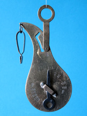 ![]() handheld letter scale with two ranges | I don't know who made this letter scale. It is certain, however, that this hand-held letter scale was intended for use in Sweden and was likely made there. The outline of the scale is known from the Englishman Nathaniel Richard Hall. Several scales with this contour have already been described here, see for example the goose neck, the Let-R-Way, and the Loth letter scale. Also this Parnell, this Stauder advertising replica of the Parnell letter scale, this commercial version of Swissair, the Frans Svanström, also this Frans Svanström, and the Universal Letter Scale. | ![]() back of the handheld letter scale |