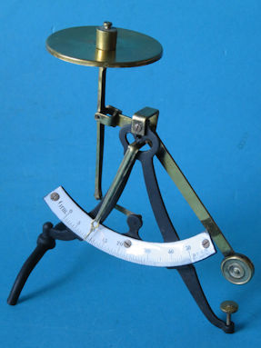 ![]() letter scale up to 50 grams | This is a simple letter scale with only one range up to 50 grams. The frame is constructed of folded sheet steel sections joined with rivets. The swivel base is also made of folded steel. The frame's shape resembles the old cast iron frames, see this one for example letter scale and this letter scale. It is likely that this letter scale was made by Philipp Jakob Maul in the more recent period, 1930-1940. The mechanism is made of brass. The enamel scale has graduations of half grams up to 50 grams. On the left side of the scale is Grm., an abbreviation for the gram unit; on the right, only D.R.G.M. 168741 is shown. D.R.G.M. stands for Deutsches Reich Gebrauchs Muster, a cheaper and easier to obtain design protection, compared to protection with a patent. Unfortunately, D.R.G.M. 168741 did not yield a correct match at the German patent office. | ![]() back of the letter scale |