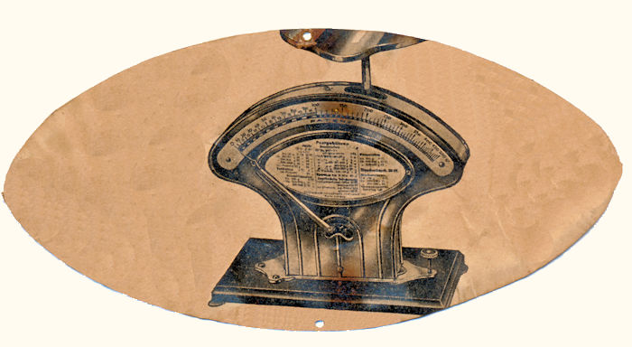 ![]() Rictus letter scale, maker Ph.J. Maul | After twenty-five years of collecting letter scales, I am sometimes still surprised on auction sites by versions of letter scales that I have never seen before in all those years. I saw this Rictus with postage rates on an Austrian auction site. They are German postage rates from the period December 1, 1933, to May 1, 1939. The scale was missing the letter plate, and the paper oval with the rates was heavily discolored and stained. It was no longer easy to read. The rates are framed in a brass frame attached to the Rictus with four small screws. Changing the rate paper is therefore a difficult task. I disassembled a few things to clean and scan them and polish up the list. To my surprise, there was an image of a Rictus with postal rates on the back of the rate paper; see the photos. I carefully edited the scanned front of the rate sheet in a photo editing program, made it clearly legible, and printed it on slightly thicker paper. I also cleaned up the scan of the back of the rate sheet; see the photos. Underneath the paper, virtually undamaged, is the well-known Rictus name oval with the abbreviation D.R.P. and patent number 384478. On the back of this Rictus letter scale, a factory plate from Gottl. Kern & Sohn is attached with two small screws. Also on the back is the logo with four lowercase Ms surrounding a large M, a later version of the logo by Philipp Jakob Maul from Hamburg, Germany. This Rictus was undoubtedly made by this Ph.J. Maul; I do not know who made the addition with the framed postage rate. The firm Kern & Sohn most likely supplied this Rictus. Previously, a letter scale with German postal rates on cardboard was shown on this website, see the bakelite letter scale. Switching to a new rate card is much simpler on that. | ![]() back of the Rictus letter scale |
